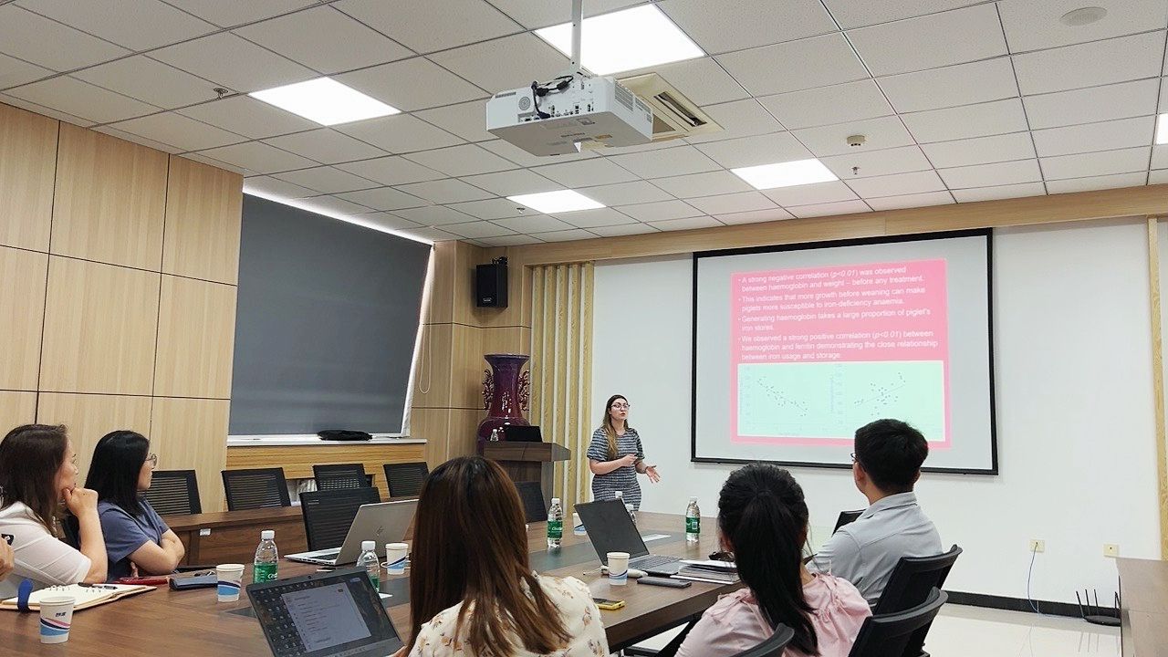 交流会上,Chloe博士作了题为“The gut microbiota of weaning piglets-how the limitation of iron could lessen farmers dependence on zinc oxide”的学术报告。报告中指出,饲料中抗生素的禁用导致了仔猪养殖端对氧化锌的依赖。然而,氧化锌的过量使用又加剧了畜禽排泄物中锌对环境的污染。面对这一挑战,Chloe博士分享了她博士期间关于铁添加剂量与仔猪肠道健康之间关系的研究成果。她创新性的发现,减少断奶仔猪饲粮中铁的添加量,不仅有益于其肠道健康,还有望降低对氧化锌依赖。