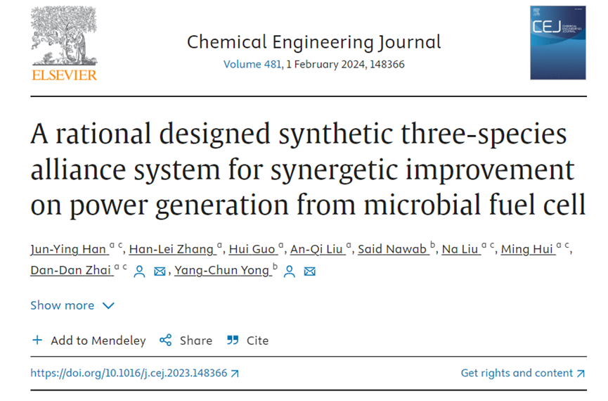 翟丹丹副教授课题组在国际著名学术期刊《Chemical Engineering Journal》(影响因子IF=15.1,中科院1区,化学-工程领域TOP期刊)在线发表了题为“A rational designed synthetic three-species alliance system for synergetic improvement on power generation from microbial fuel cell ”的研究论文,我校为该论文的第一署名单位,亚洲av
