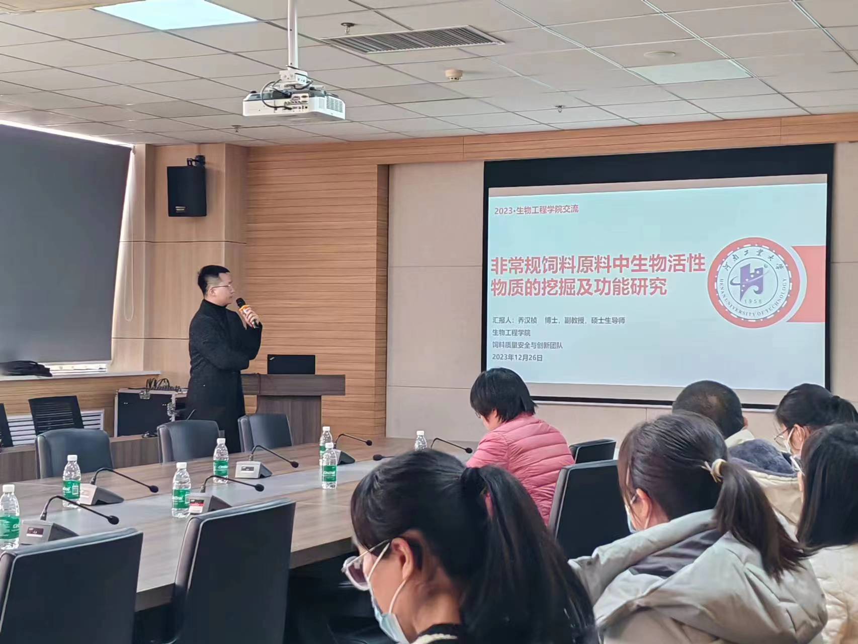 乔汉桢副教授首先对亚洲av长期以来对学科建设和科研团队工作的支持和引领表示感谢,并结合自己入职以来的科研历程,做了题为《非常规饲料原料中生物活性物质的挖掘及功能研究》的学术报告。重点介绍了我国非常规饲料原料资源的现状、原料营养价值、功能性成分的挖掘以及在畜牧生产上的应用。指出我国粮食安全主要问题在于“饲料粮安全”,非常规饲料在保障我国饲料粮安全上具有重要意义。针对非常规原料饲料化中存在饲料数据库不完善和高值化利用加工技术欠缺等现状,系统讲述了自己所在的“饲料质量与安全创新团队”近年来采用挤压、汽爆、酶解、发酵及其协同工艺,开展针对甘薯渣、地黄渣、油莎豆粕、花椒籽粕、亚麻籽粕等非常规饲料原料的精准加工和技术创新,并进一步在体内验证其改善畜禽生产性能的功效。