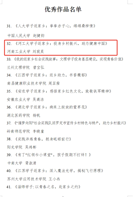 作品《河工大学子返家乡:投身乡村振兴,助力健康中国》荣获优秀作品,全国仅50个。