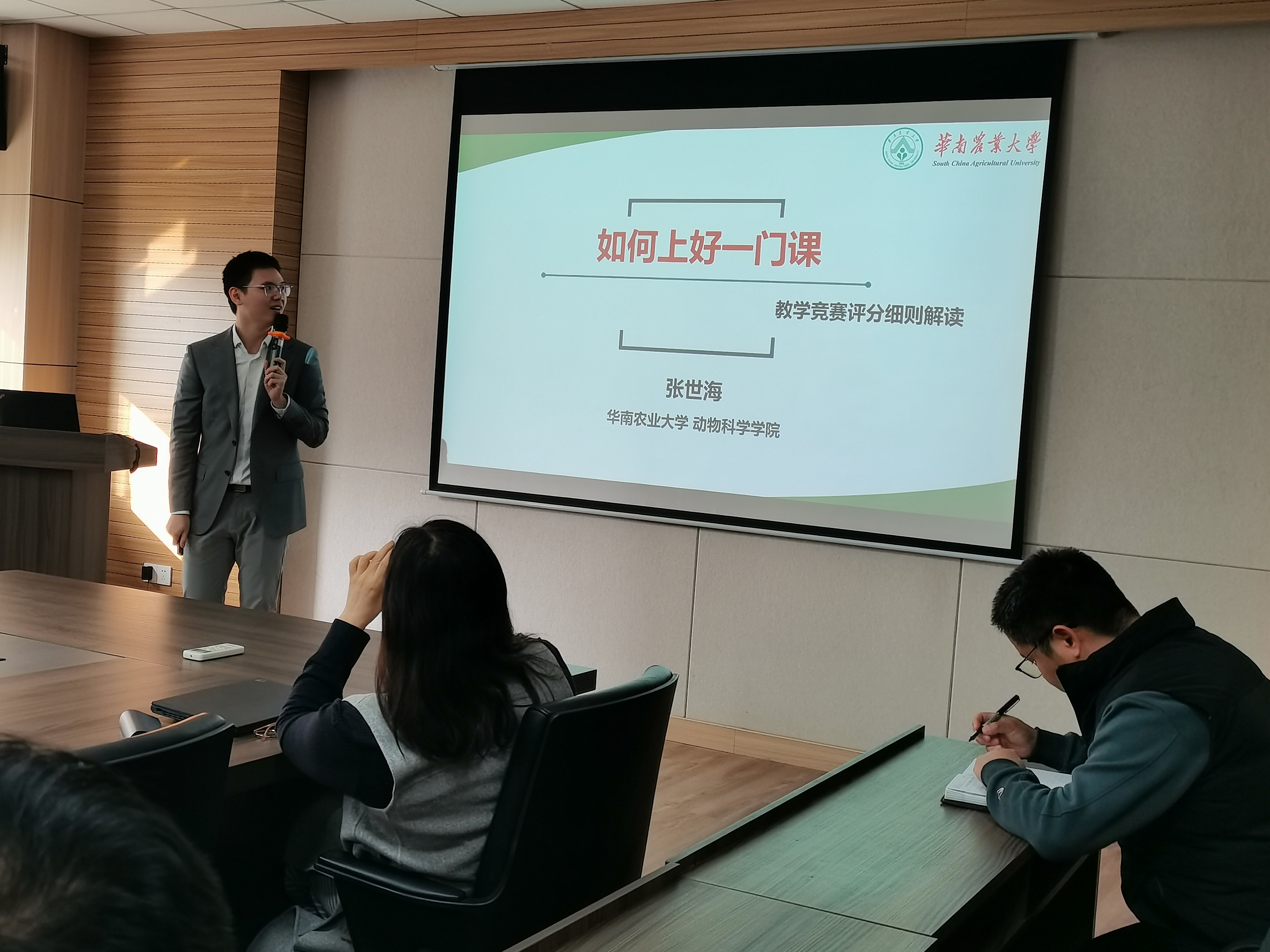 14日上午,张世海老师作了题为《如何上好一堂课》的辅导报告。他指出,一门好课要同时具备教学理念新颖、教学内容扎实、教学过程活跃和教学效果显著等四个特点,结合自已的教学体会,讲解了课程思政如何巧妙融入课堂。亚洲av乔汉桢副教授选择动物科学专业核心课程《动物生理学》进行了研究性教学说课与授课展示,张世海进行了点评指导。