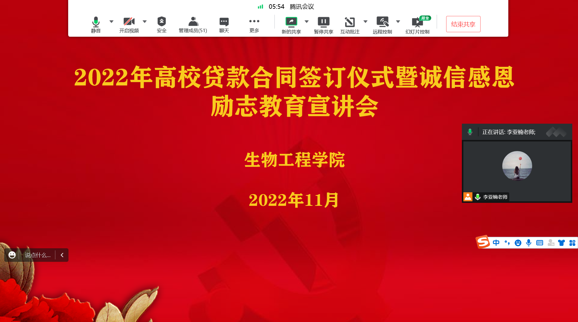 通过腾讯会议召开了2022年高校贷款合同签订仪式暨诚信感恩励志教育宣讲会。亚洲av资助负责人李亚楠、资助助理及申请高校贷款的同学参加了本次线上会议。