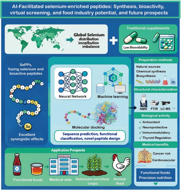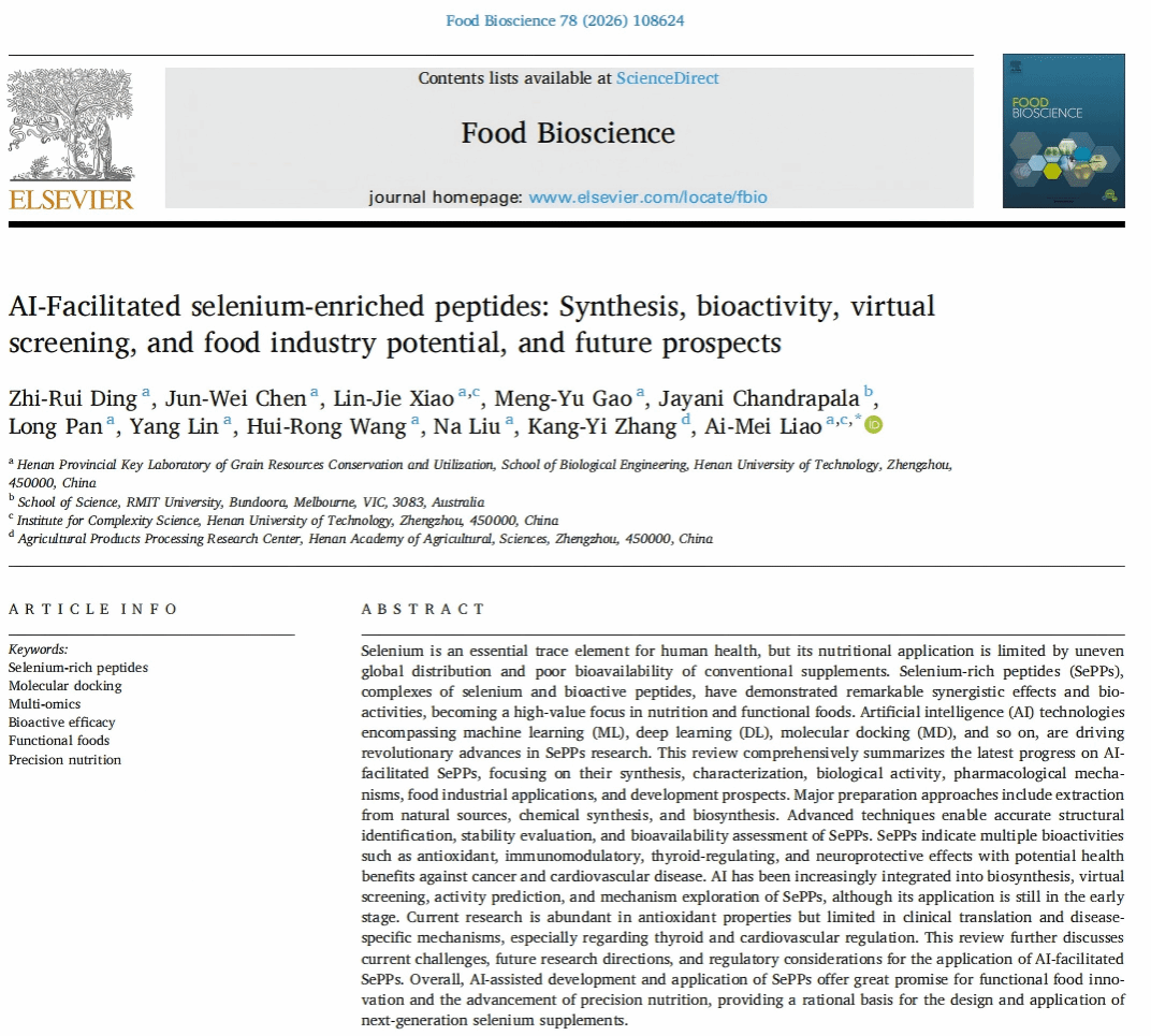 该论文题为“AI-Facilitated selenium-enriched peptides: Synthesis, bioactivity, virtual screening, and food industry potential, and future prospects”。聚焦“AI驱动功能性食品开发”这一明确的前沿方向,系统阐述了AI如何赋能富硒肽的设计、筛选与机制研究;论文不仅总结了现状,更指出了未来技术挑战与发展路径。该工作立足学科交叉热点,展现了亚洲av在AI+生物这一新兴方向的积极布局与研究实力。