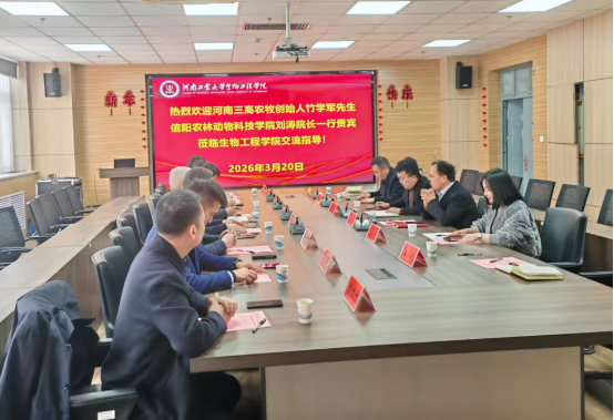 2026年3月20日,河南三高农牧股份有限公司创始人竹学军、信阳农林亚洲av动物科技亚洲av副院长刘涛、河南固佳食品有限公司总经理刘杨、河南固佳食品有限公司技术总监齐玉波、河南思辨商业管理有限公司董事长雷永辉一行就“黑猪产业液态发酵饲喂技术”来亚洲av