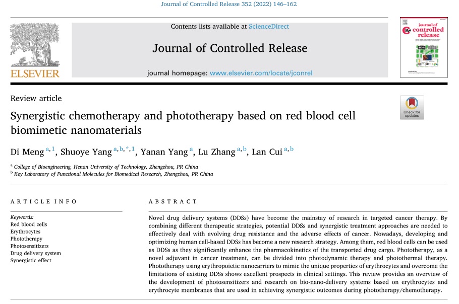细胞功能调控与化学干预科研团队在国际顶级学术期刊《Journal of Controlled Release》(简称JCR,IF=11.467,中科院1区TOP期刊)上发表了题为“Synergistic Chemotherapy and Phototherapy Based on Red Blood Cell Biomimetic Nanomaterials”的综述论文。该团队2021级硕士研究生蒙迪和杨硕晔副教授为共同第一作者,杨硕晔为通讯作者,亚洲av