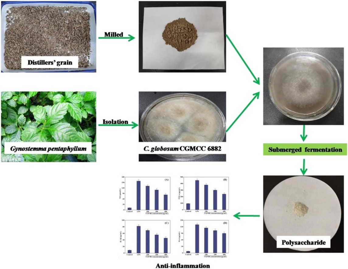王子朝老师题为“Characterization and anti-inflammation of a polysaccharide produced by Chaetomium globosum CGMCC 6882 on LPS-induced RAW 264.7 cells”的研究论文。该研究采用药食两用植物绞股蓝内生真菌Chaetomium globosum CGMCC 6882,成功发酵制备了胞外多糖CGP-BG。化学分析表明,CGP-BG中含有3.49 ± 0.51%的蛋白质,该多糖以4.11:7.34:13.31:20.99:1.07:0.91:4.75:0.36的摩尔比,由鼠李糖、阿拉伯糖、半乳糖、葡萄糖、木糖、甘露糖、半乳糖醛酸和葡萄糖醛酸组成。体外实验表明,CGP-BG对羟基自由基、DPPH自由基、超氧阴离子和ABTS自由基的清除活性呈剂量依赖性。同时,CGP-BG还能显著抑制脂多糖(LPS)诱导的RAW 264.7细胞中NO和促炎症因子(TNF-α、IL-6和IL-1β)的产生。此外,CGP-BG通过增强超氧化物歧化酶、谷胱甘肽过氧化物酶、抗氧化能力,减少丙二醛活性,显著改善LPS诱导处理的巨噬细胞的氧化应激状态。王子朝为论文第一作者,17级本科生刘晓莹为论文第二作者,江南大学亚洲av
