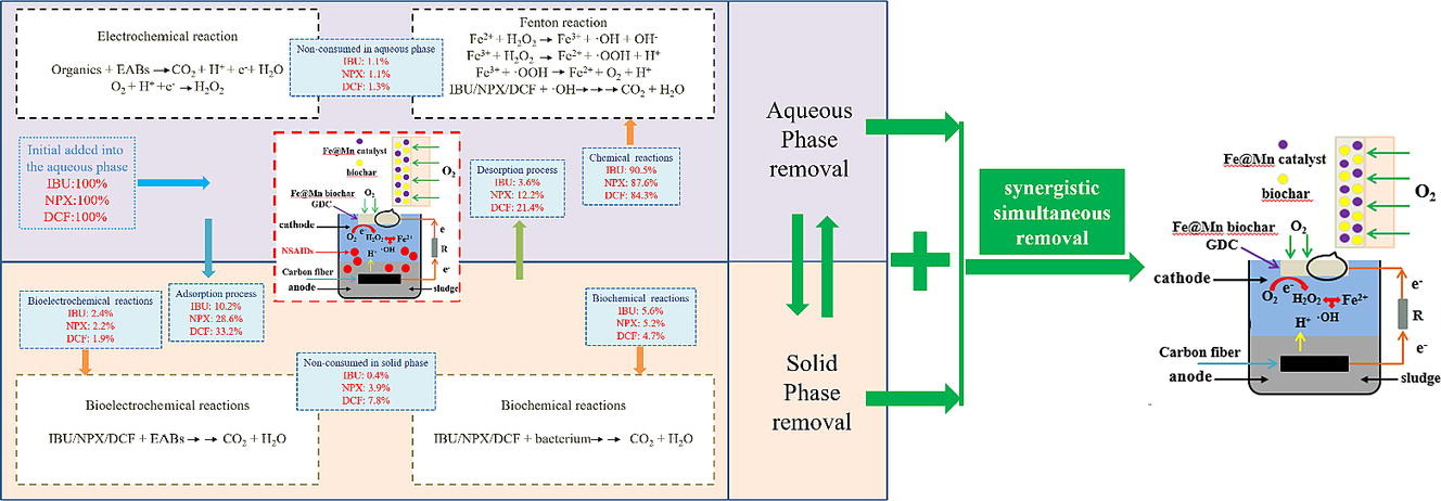 电芬顿系统作为一种高级氧化工艺近年来被用于实现NSAIDs的高效去除,但现有体系仅针对单一水相中NSAIDs的去除,忽略了污泥中的残留。针对此,本研究构建了基于沉积物燃料电池的生物电芬顿系统以实现废水和污泥中NSAIDs的同步去除,通过分析系统各组分中NSAIDs的浓度变化和污泥微生物群落结构组成,探究了NSAIDs在该体系废水和污泥中的协同共降解机理。研究成果为NSAIDs等药物环境残留的生物去除提供了一种新的工艺参考和理论依据。